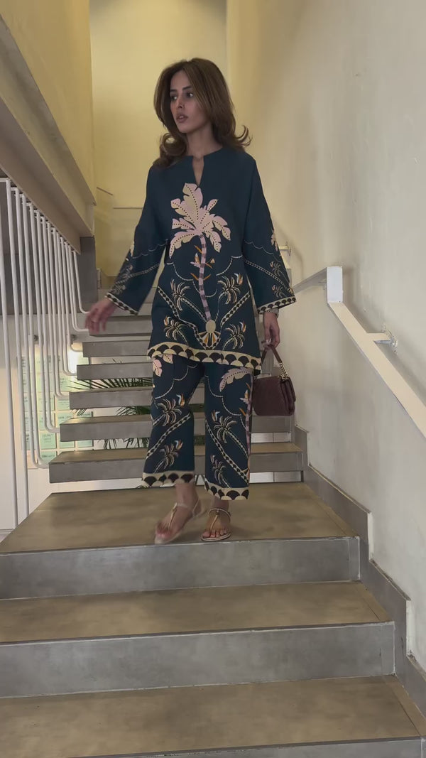 Make a statement with this elegant co-ord set, detailed with delicate cream palm tree prints that add a touch of sophistication. Designed in rich dark blue fabric, the intricate motifs create a striking contrast, blending modern elegance with timeless tradition—perfect for festive occasions, evening gatherings, and special celebrations.