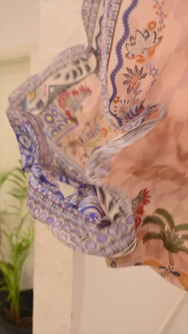Beautiful three-piece set features a soft beige fabric with a vibrant, intricate print inspired by classic Persian art.The detailed motifs and folk-art style patterns in shades of blue and orange create a sophisticated look.Complete with a matching tunic, trousers, and a printed dupatta, this ensemble offers a touch of cultural elegance.