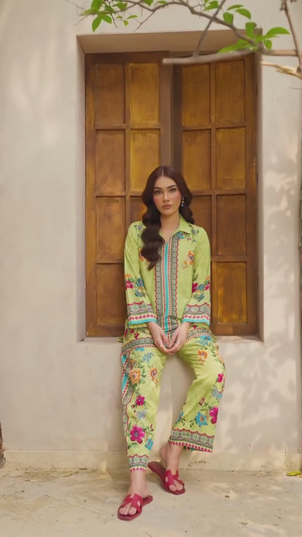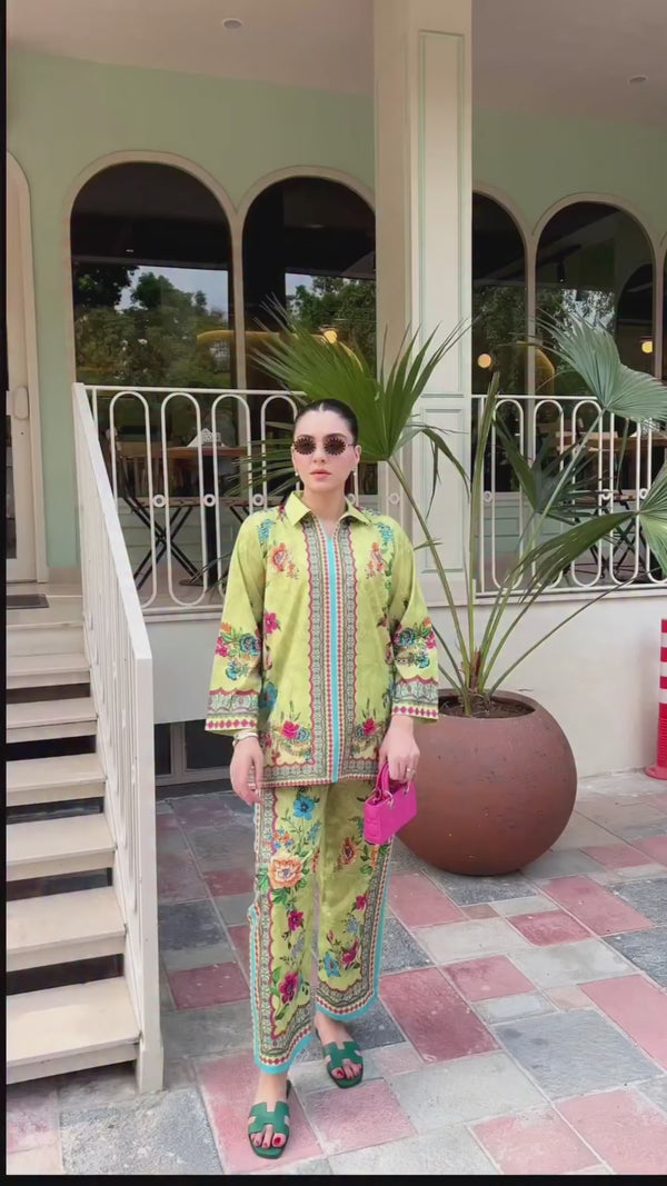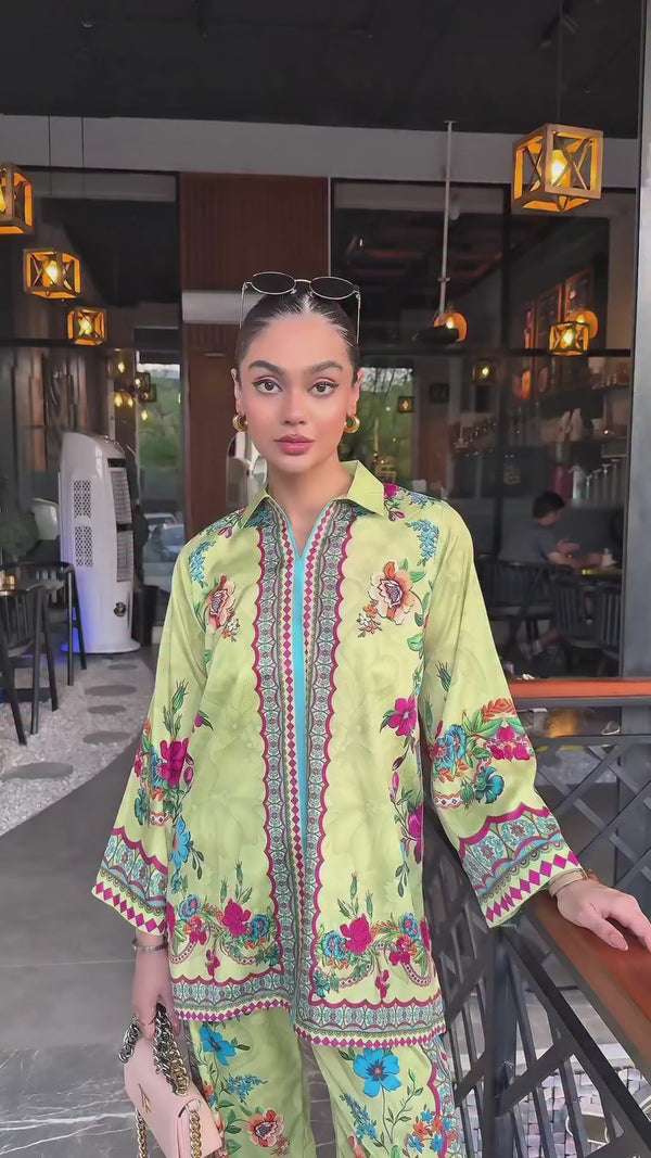 Crafted from a premium, smooth fabric, this set is a luxurious statement piece. The deep chartreuse color provides a vibrant backdrop for the detailed floral print, while the meticulously designed ornamental borders in contrasting shades give the ensemble a polished, high-end finish. The comfortable yet refined silhouette makes this outfit a perfect choice for an elevated daytime event.