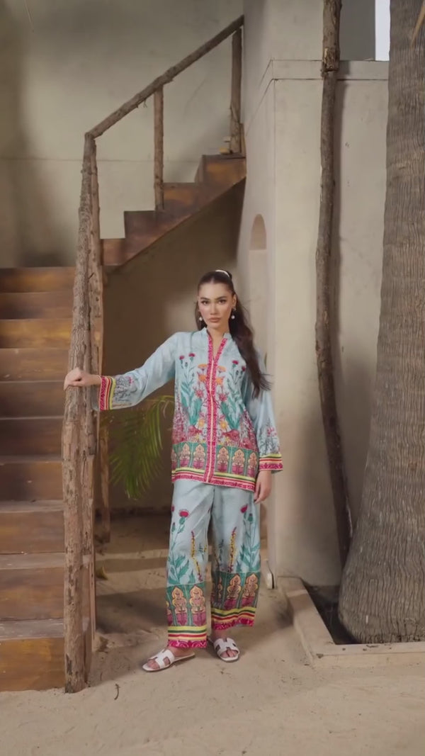 Elegant sky blue printed cord set beautifully showcases a mix of vibrant floral and geometric patterns, creating a striking yet harmonious look. The straight long kurta is thoughtfully paired with coordinated trousers, ensuring both comfort and style throughout the day.