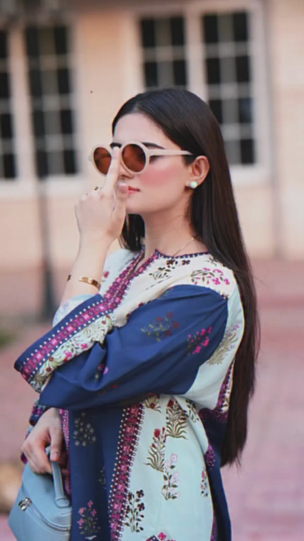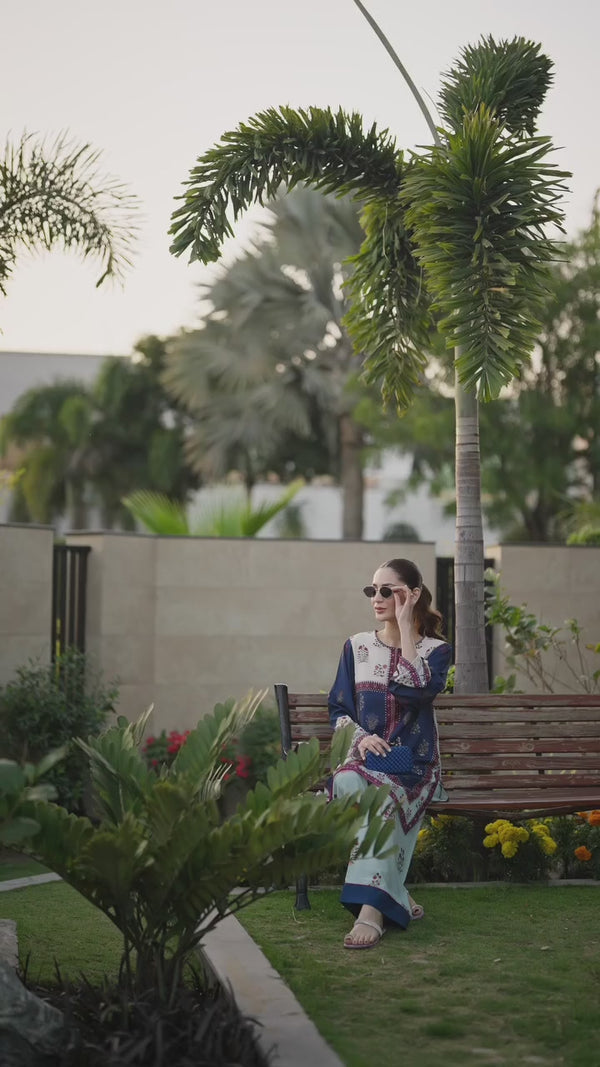 Elegant ensemble features a wide-leg trouser and a flowing kaftan-style top, both made from a comfortable, lightweight fabric. The base is an off-white shade, beautifully adorned with a vibrant, intricate print of floral and geometric patterns. The color palette, dominated by rich oranges, deep blues, and warm yellows, gives it a sophisticated, artistic feel.