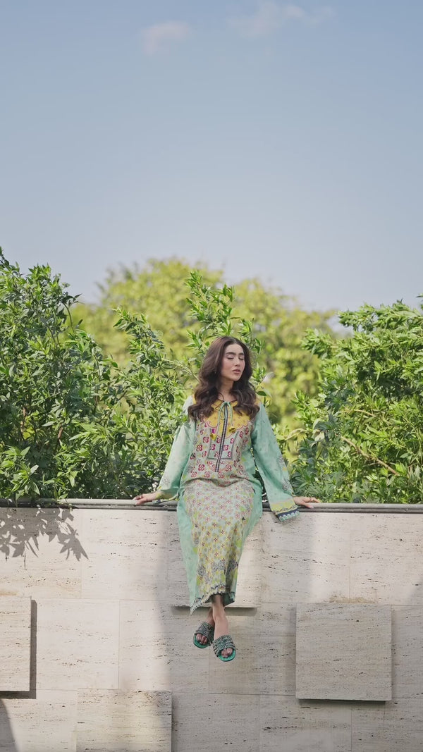 Radiate luxury and grace with the " Sun-Kissed Flora" Kurta Set. The long, straight-cut kurta is a stunning mix of serene and vibrant hues. Its upper body is a bold, mustard yellow with subtle floral patterns, while the rest is a calm mint green featuring an elaborate print of winding florals and elegant geometric shapes.
