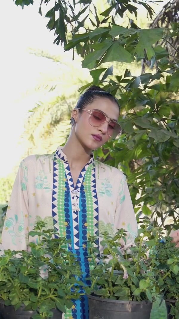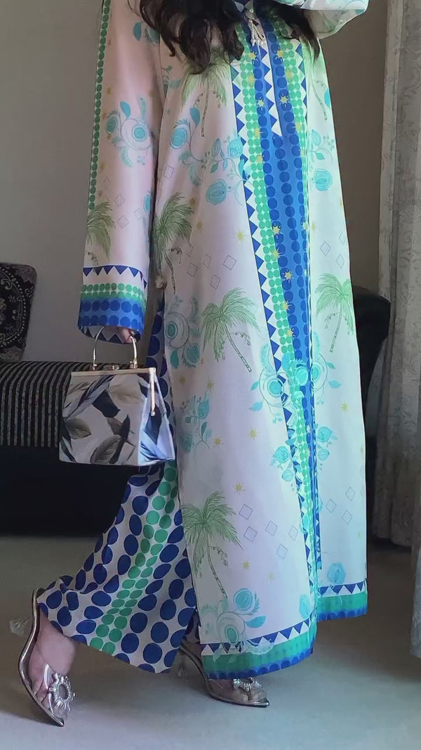 Graceful cream and blue kurta set adorned with tropical palm motifs and geometric borders, featuring a stylish front-button detail. Designed with a relaxed fit and lively garden-inspired prints, it’s perfect for daytime outings and casual events.