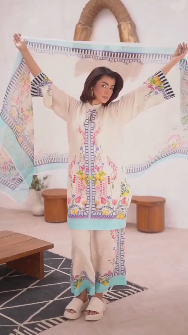 Charming Cream Kurta Set with Dupatta, featuring delicate floral motifs, whimsical stripes, and soothing shades of aqua and lemon. Made from soft, breathable fabric, this set exudes effortless grace, ideal for daytime celebrations or relaxed, chic occasions.