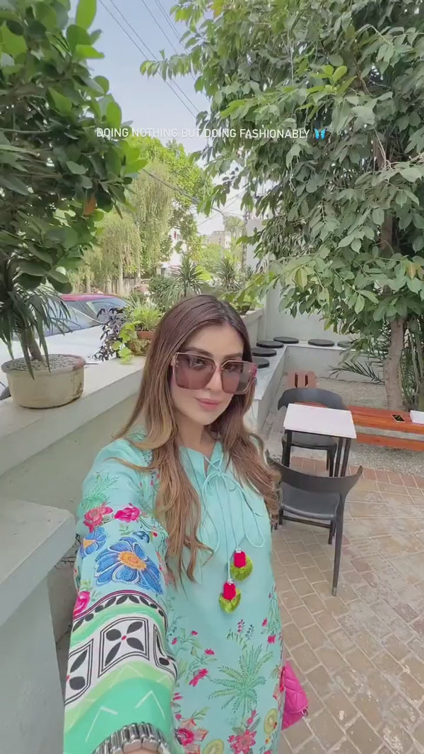 A breezy Ornate Kaftan Dress crafted from soft Korean BSY fabric, featuring vibrant botanical florals on a calming aqua base. Its straight ankle-length silhouette, geometric borders, and keyhole neckline with tassels blend traditional charm with modern comfort—perfect for everyday elegance or daytime events.